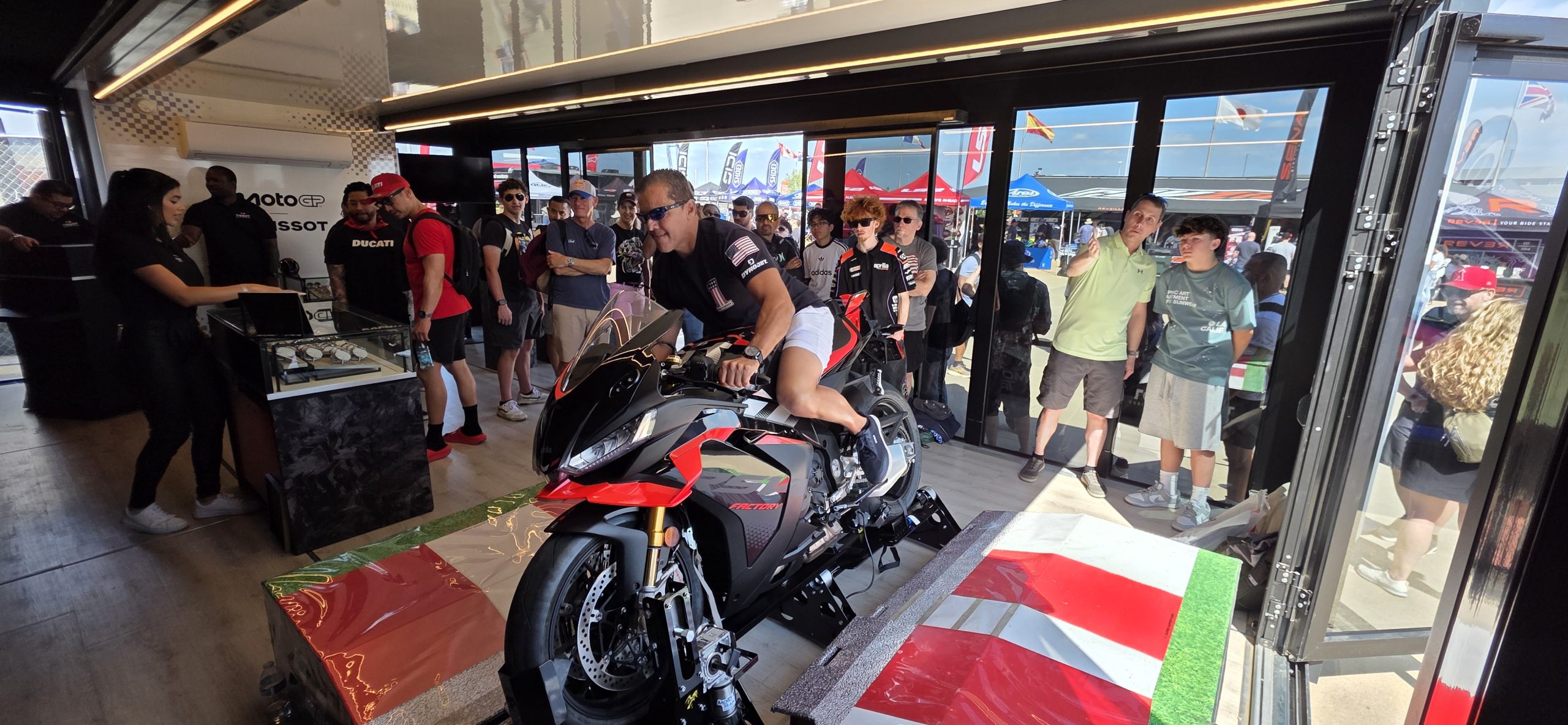 Thanks to Aprilia, visitors could ride on real motorcycles at the Tissot stand and in the VIP Village —turning a simple interaction into something much more authentic.